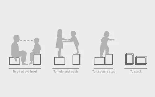 A stackable step stool in two heights, that can be used at home or in public spaces. Children can use it so they can help in the kitchen or wash their hands. The two heights allow adults and children to sit at eye level. It can